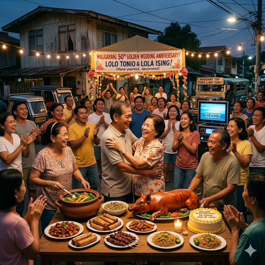 “Makinig ang lahat!” sigaw ni Kapitan. “Ngayong gabi, sine-celebrate natin ang Golden Anniversary ng pinaka-mabait na mag-asawa sa barangay natin. Wala silang anak, pero tinuring nila tayong lahat na mga anak nila!”