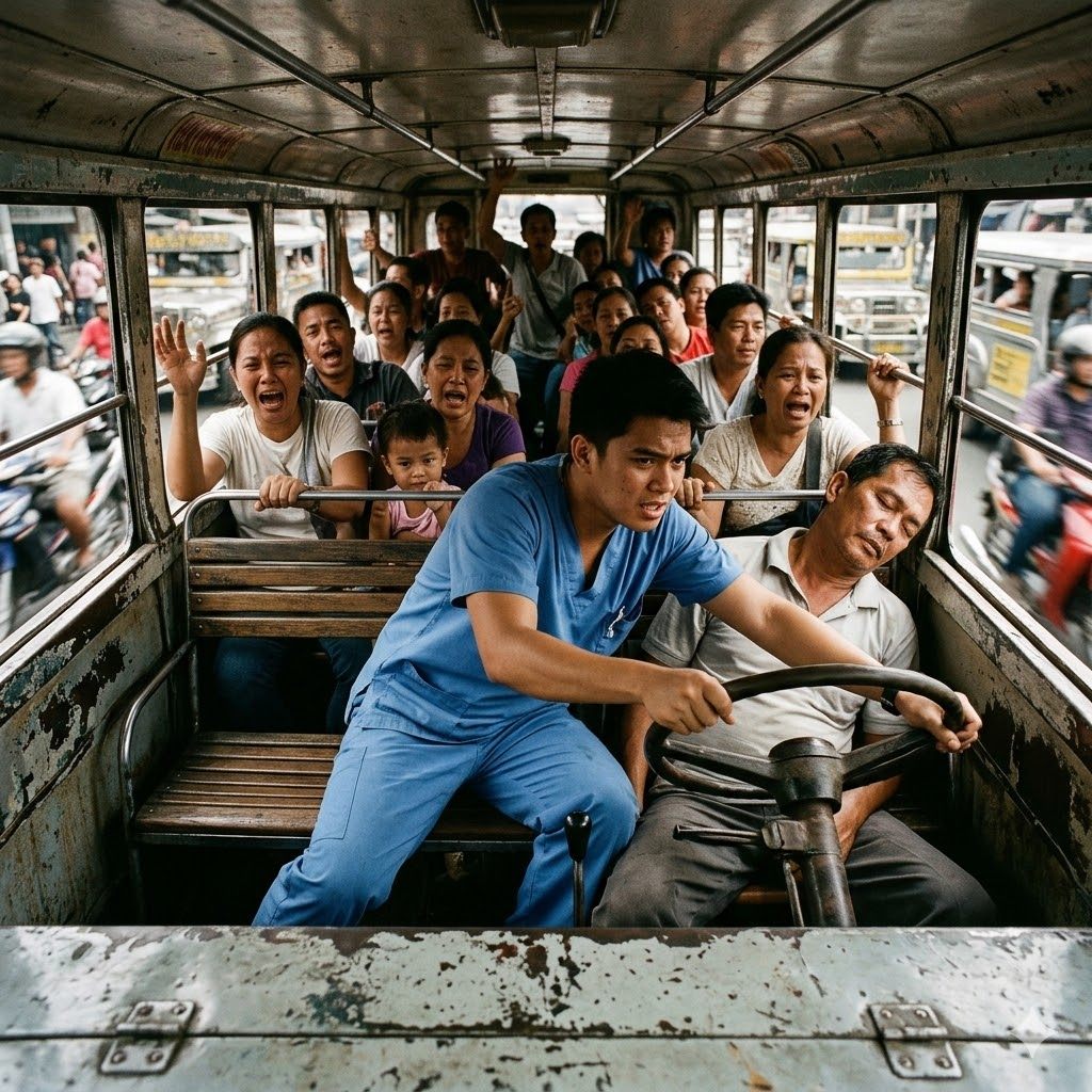 “Hawakan niyo ang ulo ni Manong! Huwag hayaang mauntog!” utos ni Kiko, lumabas ang pagiging nursing student. “Buksan ang bintana para makahinga siya! Tumawag ng ambulansya, bilis!”
