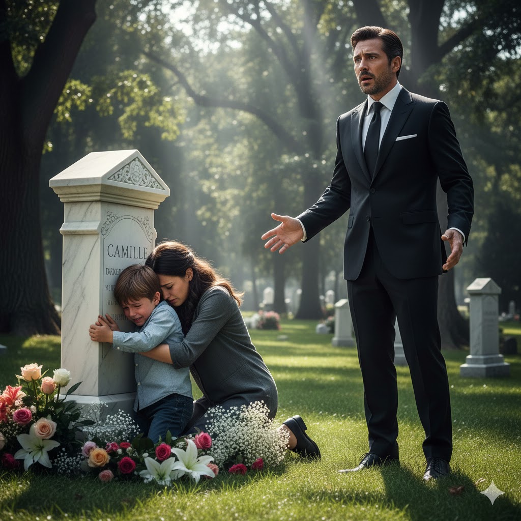 He froze. A stranger—a woman named Selena—was kneeling on the grass. Beside her, a young boy, Noah, was clinging to Camille’s headstone. Leandro felt the ground beneath him shift when the boy cried out, “Mama Camille! Why did you leave us?”